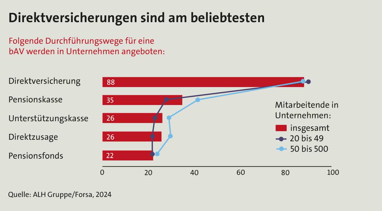 On top komme hinzu, dass die Arbeitnehmer einen verpflichtenden Zuschuss von mindestens 15 Prozent erhalten, und es der einzige Durchführungsweg sei, bei dem für den Arbeitgeber keine Beiträge zur Insolvenzsicherung fällig werden. Auch Jacques Wasserfall, Vorstand der Württembergischen Lebensversicherung AG, bekräftigt: „Die Direktversicherung ist ein Durchführungsweg mit langer Tradition; sie besticht durch Einfachheit und einen hohen Verbreitungsgrad nicht nur bei großen, sondern auch bei kleinen und mittelständischen Unternehmen.“
