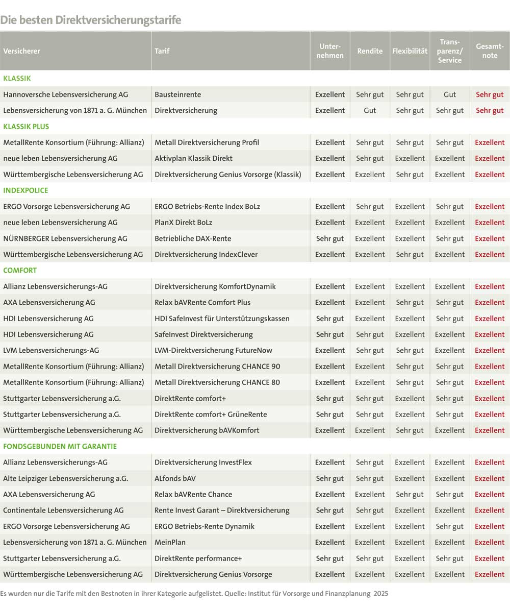 Im aktuellen bAV-Rating 2025 untersucht das Institut für Vorsorge und Finanzplanung (IVFP) die Direktversicherungsprodukte. Die Einteilung der Tarife erfolgt dabei in die Kategorien „Klassik“, „Klassik Plus“, „fondsgebunden mit Garantien“, „Comfort“ und „Indexpolicen“, jeweils als beitragsorientierte Leistungszusage (BOLZ). Bei einer BOLZ legt der Arbeitgeber einen bestimmten Beitrag fest, der für die Altersvorsorge des Mitarbeiters aufgewendet wird. Der Arbeitgeber verspricht dabei, bestimmte Beiträge in eine Anwartschaft auf Alters-, Invaliditäts- oder Hinterbliebenenversorgung umzuwandeln. Dabei ist keine Garantie auf eine bestimmte Mindestleistung aus den eingezahlten Beiträgen vorgesehen. Die Ergebnisse werden für die Veröffentlichung mit den Auszeichnungen „exzellent“ – „sehr gut“ – „gut“ bewertet. Die Gesamtnote des Ratings setzt sich aus vier Teilbereichsnoten zusammen: Unternehmen (Gewichtung 25%), Rendite (40%), Flexibilität (25%) sowie Transparenz/Service (10%).